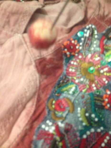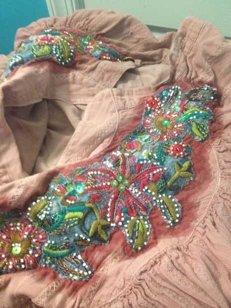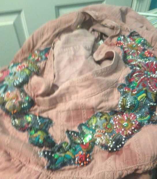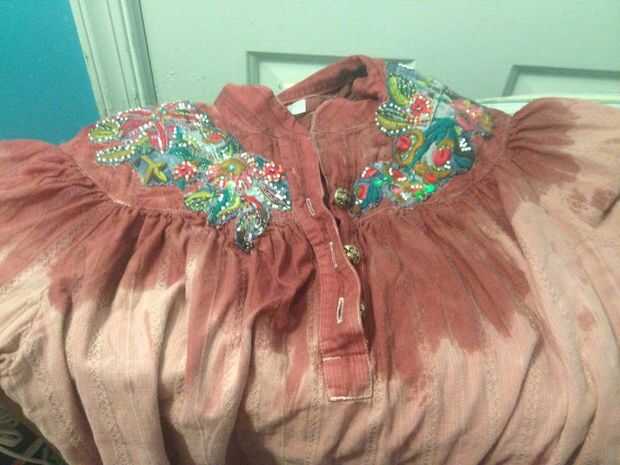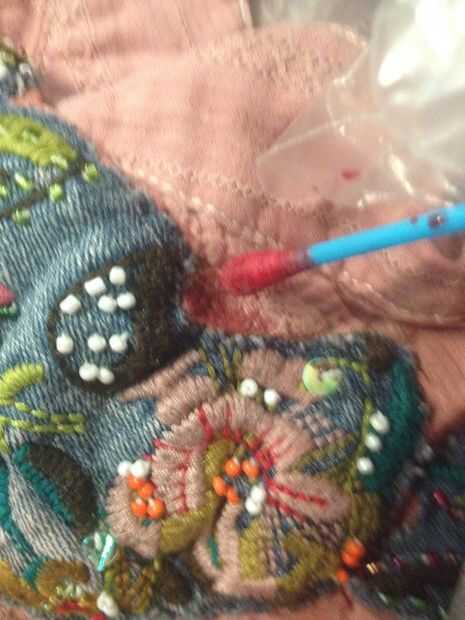Puse a la parte superior en mi tablero que plancha, con una bolsa de basura grande por debajo. El área del cuello fue donde empecé. Pegamento de Aleene fue alrededor de las fronteras de la mezclilla para protegerlo. Permitió al proyecto secar 24 horas antes de aplicar el tinte.