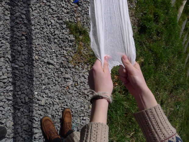 Con su socio permanente oppisite sosteniendo dos extremos de la tela de cada uno, hacer un pliegue de dedo índice del pulgar en la misma proporción que entre ellos coincidencia de ambos lados.