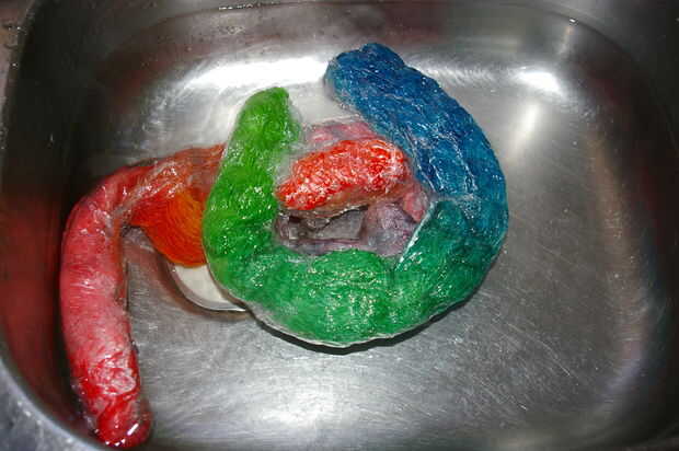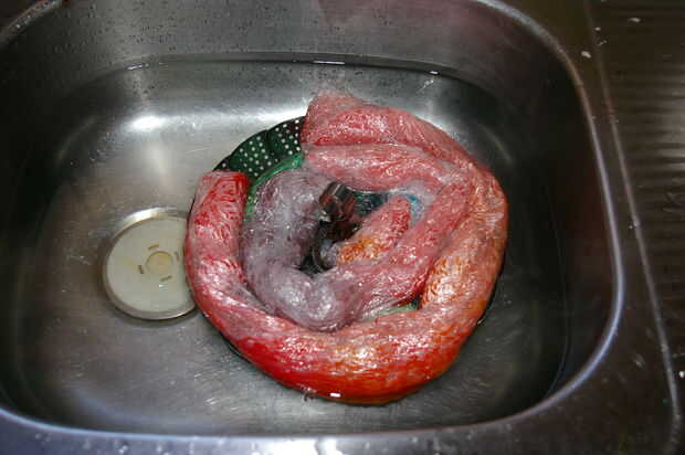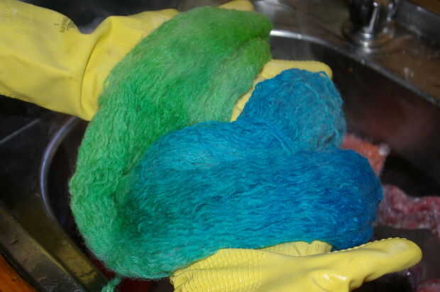 Después tus madejas han sido vapor por 30 min que estará muy caliente cuidado al sacarlos y asegúrese de que se, enfríelas gradualmente o se sentían. Sacó el aparato entero y ponerlo primero en el fregadero durante 5 min y ya rellenados el otro fregadero con agua calurosos con un tapón de lavado de lana. I luego suavemente libera la lana de sus paquetes en el agua y luego lo agita suavemente. Luego llena el otro fregadero de agua para un enjuague. Solo un Consejo nunca tienen la lana en el fregadero están llenando como el agua corriente podría ser suficiente para que es. El color se debe establecer por ahora si funciona su probablemente una indicación de que es necesario más vapor.
