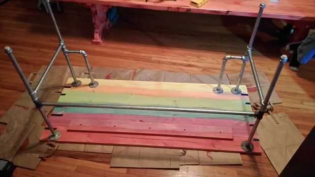 Nota: Si desea tinción/pintura/embellecer la parte inferior de su escritorio, hacerlo antes de este paso. Rápidamente y simplemente probé a mis manchas pero no es nada vale la pena alardear sobre. Si no olvidas, es gran cosa, puede aflojar las piernas o ir alrededor de ellos.