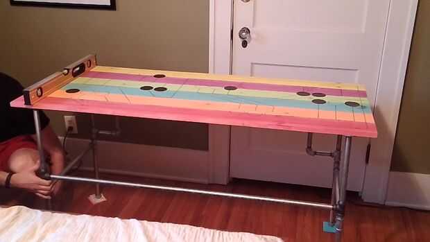 2. Nivel su escritorio utilizando un nivel y cuñas debajo de las patas para darse la oportunidad máxima de una superficie plana una vez haya terminado.