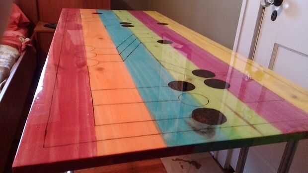 4. Preparar el acabado de alto brillo como su estado de las instrucciones y aplique a la parte superior de la mesa. Asegúrese de trabajar con rapidez y tratar de no preocuparse demasiado por las marcas claras que al extenderla, a incluso hacia fuera. Cada borde de la capa y ver gotas.