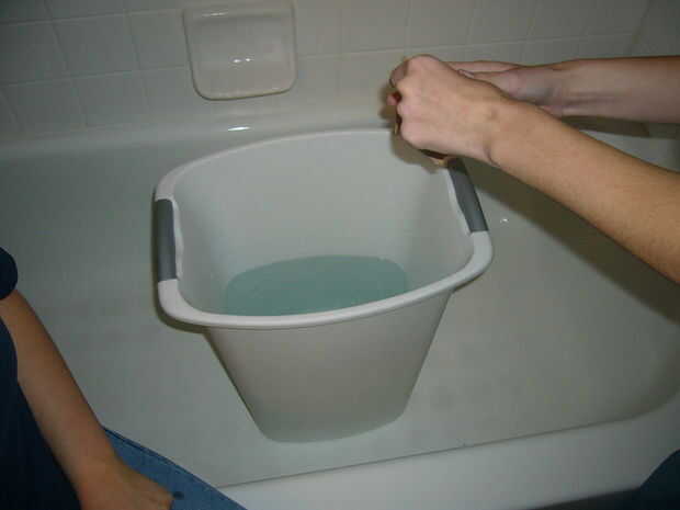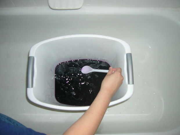 También, si usted está haciendo esto en una bañera, muy sugiero llenar la tina con suficiente agua para cubrir el fondo. Esto facilita la limpieza, como no hay tinte tiene tiempo para secar en su tina.