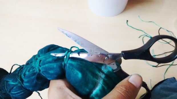 Una vez que había secado corte el hilo. Después de abrirlo vi que la pintura no había teñido la tela entera pero sólo las partes que entraron en contacto directo de la solución de la pintura.