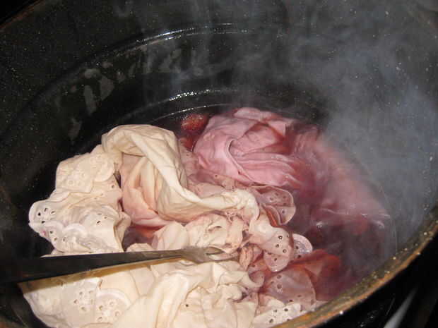 1. Después de sus manzanas han sido remojo por un rato y cree que haber conseguido todo el rojo de ellos que usted puede, siga adelante y calentar para arriba otra vez durante una hora sólo empujar a un poco más. Dejar enfriar y luego tomar su bote y filtro exterior por lo que se puede colar el tinte de las manzanas. Me gusta usar mi olla mordanting para sólo tener que tener los 2 cacharros sobre la marcha. Simplemente poner a toda su tela mojada en un balde plástico o bin para esperar.