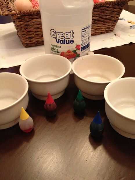 Una vez que estés listo para teñir los huevos salir 4 tazones de fuente que son lo suficientemente profundas como para sumergir un huevo en. Llenarlos con vinagre y unas gotas de colorante. Esta parte es crucial. El vinagre ayuda al color saturar el huevo y le dará colores más ricos.