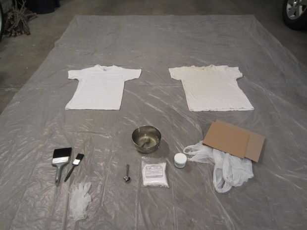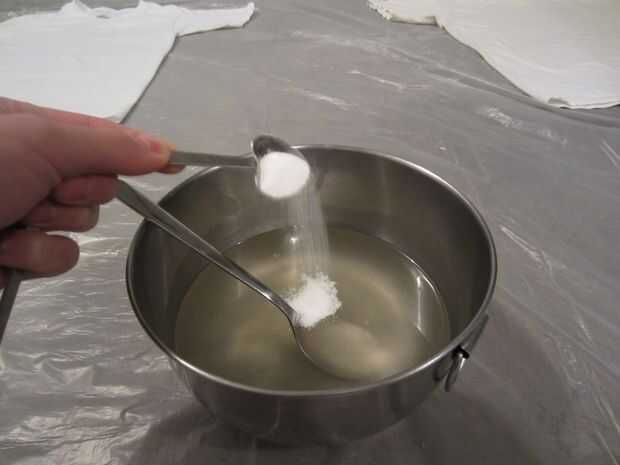 Nota: Ceniza de soda es el activador de la reacción química que se adhiere el tinte a la tela. Tan pronto como la ceniza de soda se mezcla con el tinte, comienza a perder su fuerza. Por lo tanto, es importante no tomar demasiado largo para aplicar el tinte después de mezclarla. La ceniza de la soda pierde mitad de su fuerza aproximadamente de 4 a 6 horas después de que se mezcla con el tinte.
