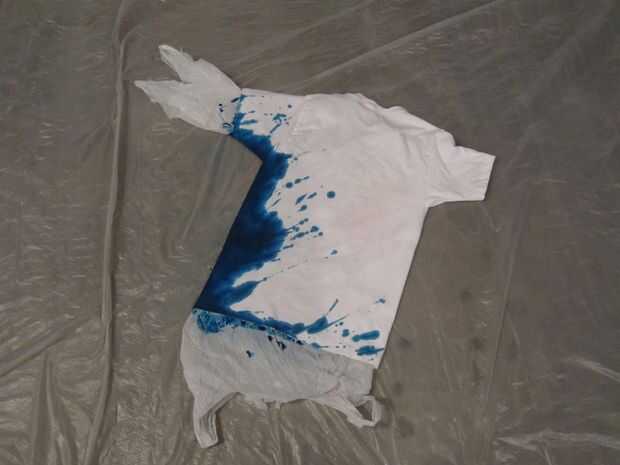 Pinté un patrón de salpicaduras por goteo un poco echar el tinte sobre un extremo de la camisa, la camisa los bancos y luego colorear la parte trasera de manera similar. Si desea reproducir este efecto, asegúrese de que el tinte no es demasiado gruesa o terminarás con globos de color en vez de una salpicadura animada.