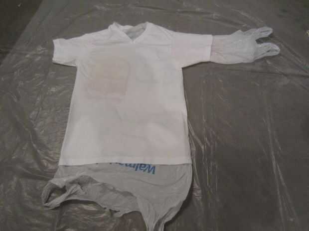 Coloque algún material resistente en la parte trasera de la tela del tinte no sangra a través al otro lado. Para este proyecto, he puesto bolsas de plástico dentro de la camiseta para que puedo trabajar en un lado de la camisa a la vez. Cartón es más rígido que las bolsas de plástico y puede que sea más fácil mover su proyecto más adelante...