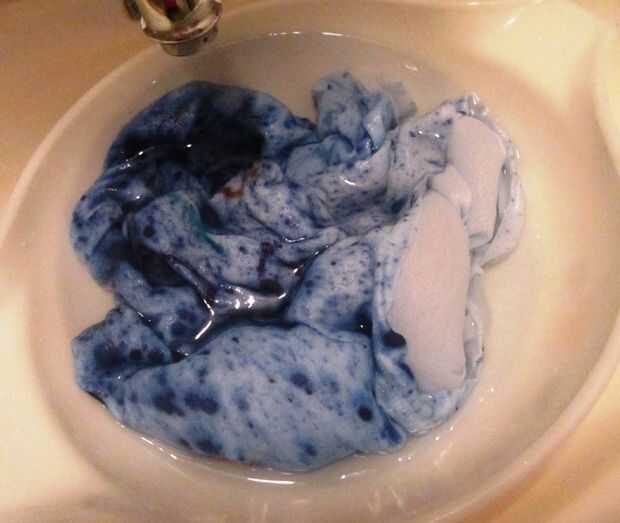 Usar agua fría (y sus guantes de goma) y enjuague, enjuague, enjuague hasta que el agua es clara.