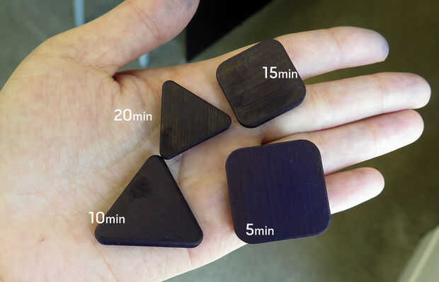 Pongo 4 piezas vero blanco en la solución de tinte con un intervalo de 5 minutos. Así las 4 piezas fueron en la solución colorante durante 20min, 15min, 10min y 5min. Se puede ver que no hay mucha diferencia entre 20min, 15min y 10min más, pero los 5 minutos uno es definitivamente más ligero que el resto. Creo que si me hubiera puesto menos poder colorante en la solución, podría ser una diferencia mayor entre ellos.