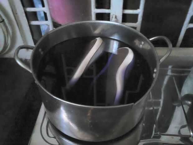 Una vez que el agua comenzó a hervir a fuego lento, verter en su tinte. Mezclar un poco antes de poner los zapatos, únicos hasta. Punta, cuando se ponen sus zapatos en, asegúrese de extraer las aletas de los zapatos para que conseguirá la máxima exposición al tinte. Una de las aletas de los zapatos era un poco más ligera en color que el otro, probablemente debido a la aleta tiene inmovilizada en el proceso de tintura o algo. En todo caso, exponer las zonas que quieras teñir.