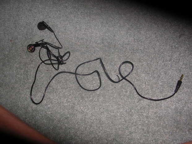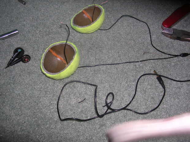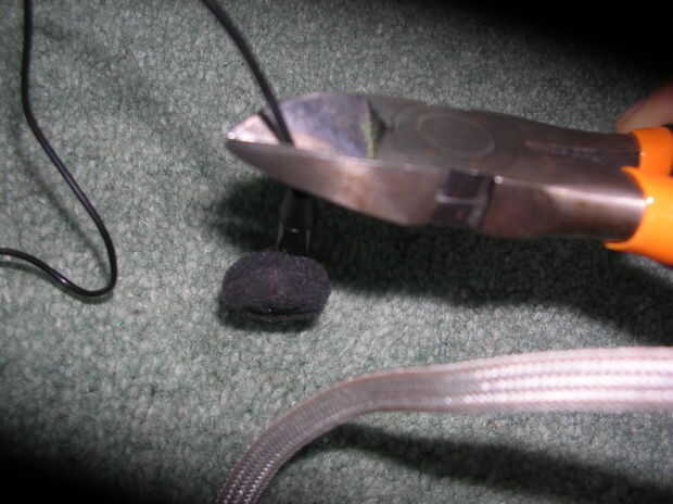 Corte su antiguo conjunto de auriculares justo debajo del auricular. Tira de una pulgada de la cubierta plástica en la parte superior Alimentación de uno a través del agujero en la mitad y el otro en la otra mitad