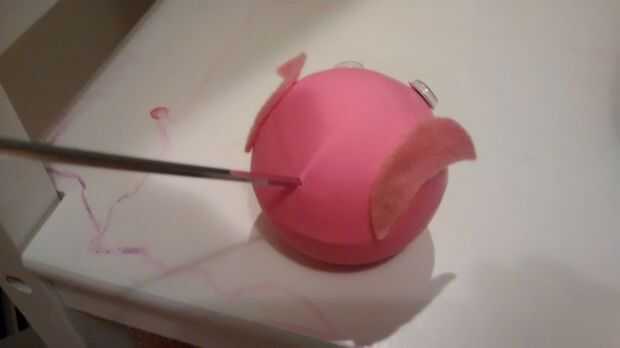 Necesitarás:1 pelota de tenis1 globo rojo2 ojos saltones1 limpiador de pipaUnos botones - negros para la autenticidad verdaderaRotuladorPaso 1: Cortar una pelota de tenis por la mitadPaso 2: Tomar un globo de tamaño estándar y corte como se muestra.P
