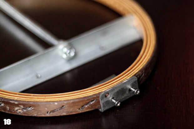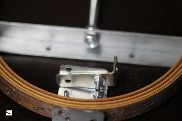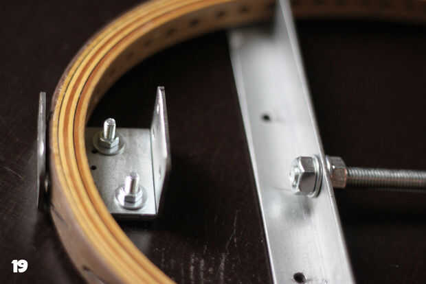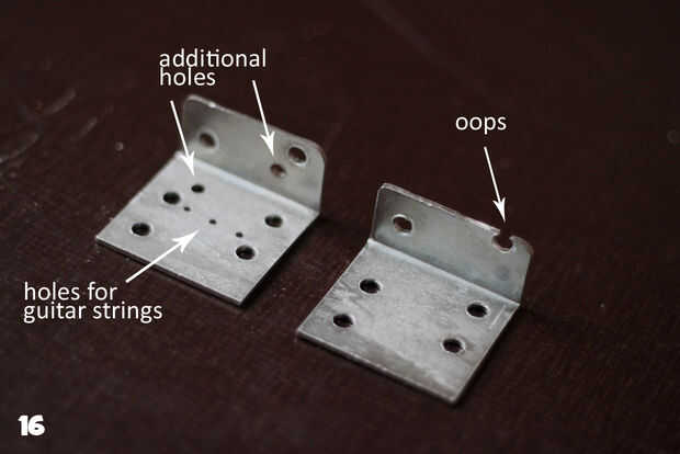 Yo he construido el puente de la guitarra de raqueta de tenis de 2 soportes (cuadro 16) fijado junto con algunas tuercas y pernos. El pedazo de cola tiene 3 agujeros adicionales para sostener las cuerdas de la 3 guitarra y tuve que perforar algunos agujeros adicionales para que se pudiera arreglar con algunos tornillos (Fig. 17 y 18). Otra vez: no te olvides de perforar agujeros. El segundo soporte en L se fija en la primera uno (cuadro 19) con el lado más largo hacia arriba. Este lado se recortará más adelante para hacer una altura perfecta.
