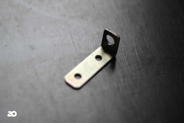 El tercer soporte en L se modifica con un lado más corto y un agujero más grande (10 mm) para celebrar la entrada de jack (cuadro 20). Se fija en el segundo soporte en L con un tornillo de M4 y una tuerca (cuadro 21). Asegúrese de que está inclinado para arriba un poco para hacer conectar tu cable de guitarra mucho más fácil. Para evitar problemas de taponamiento en este magnifico instrumento utilizan un cable con un conector angulado (cuadro 22).