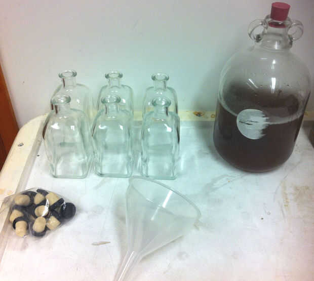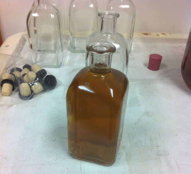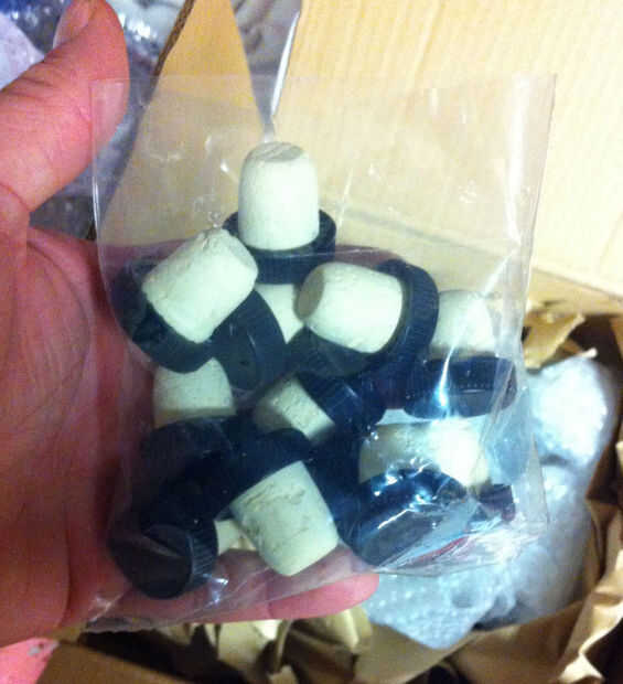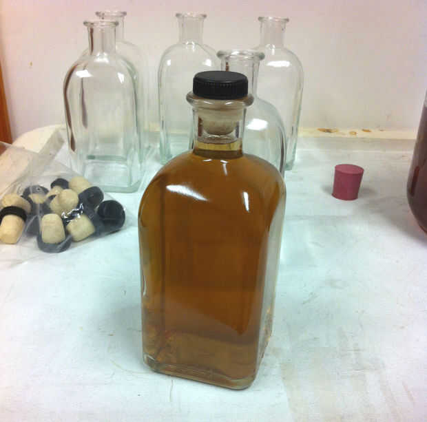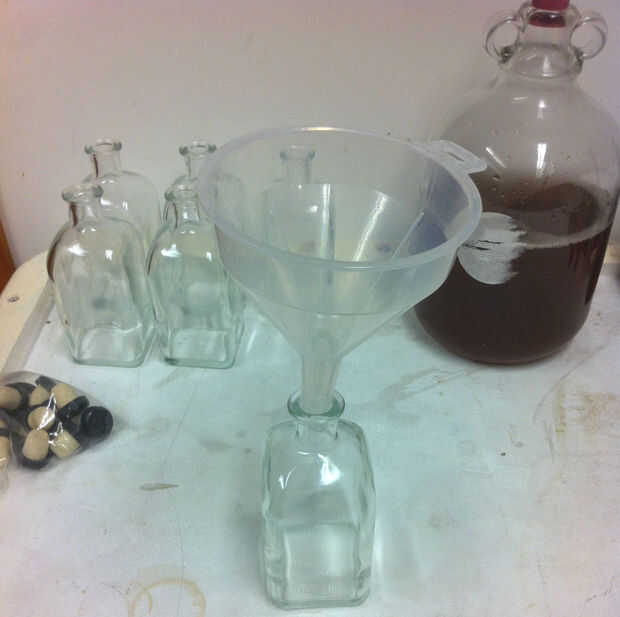 Usé un embudo para llenar las botellas y poner en un corcho que compré en la tienda del brew casero. significaron para botellas de vino pero tienen una bonita gorra negra y son el tamaño perfecto para la botella.