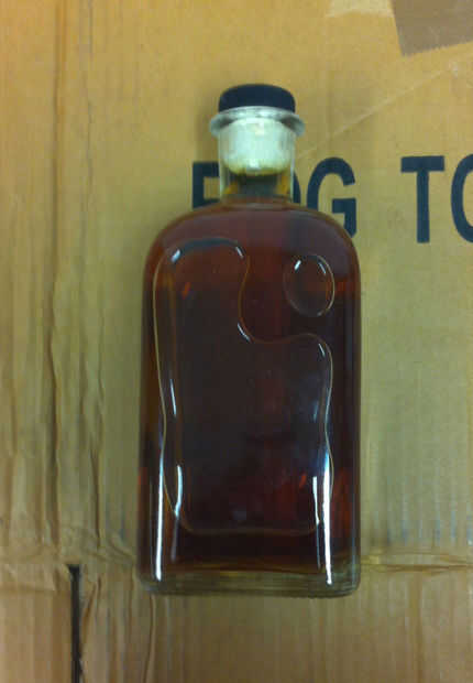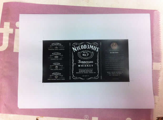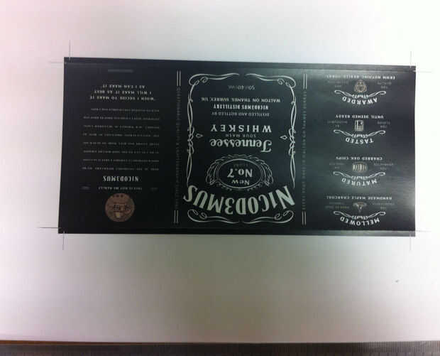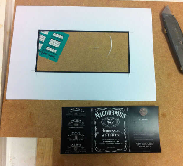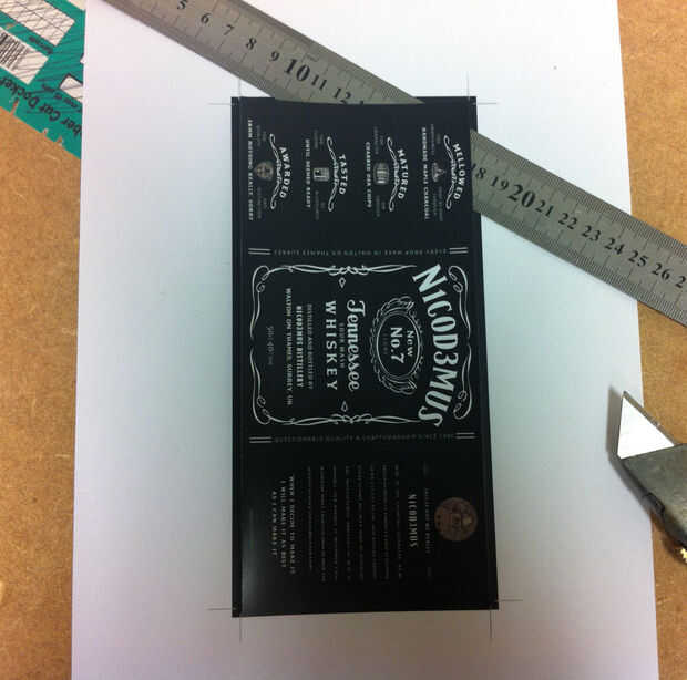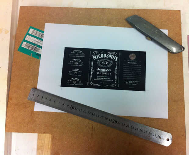 Llamé alrededor de la botella que podría alinear de la etiqueta sobre la superficie plana, en la parte posterior de la etiqueta que le puse 2 líneas de lápiz que las rayas verticales son así puedo alinear.