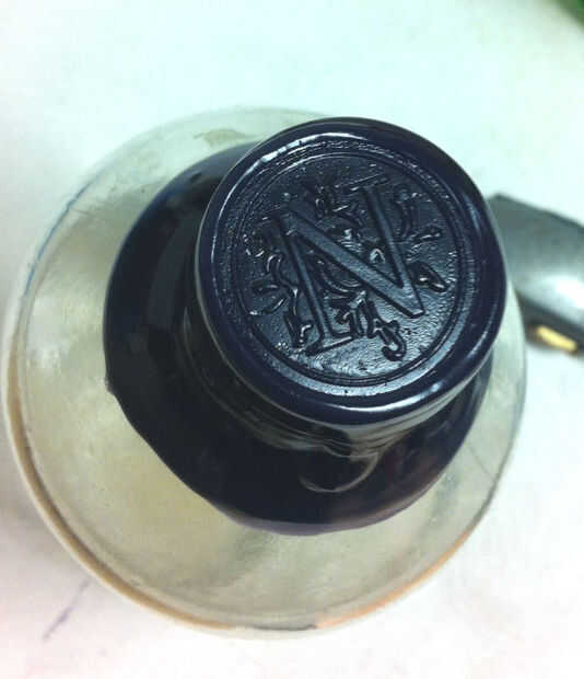 Tuve que sumergir la botella unas cuantas veces, así que dip espere unos segundos para que esa capa set un poco luego mojar otra vez y mantener la inmersión para construir las capas hasta su espesor suficiente. Sostenga la botella en el recipiente durante unos pocos segundos después de la última inmersión luego de ponerlo en el lado y rápidamente poner el sello en la parte superior, no es necesario empujar la cera es bastante suave. deje en su lugar hasta que se enfría de la cera y luego retire.