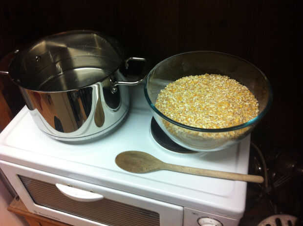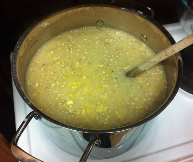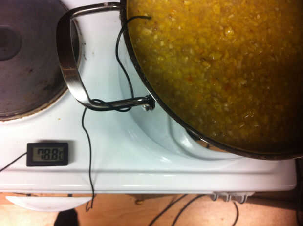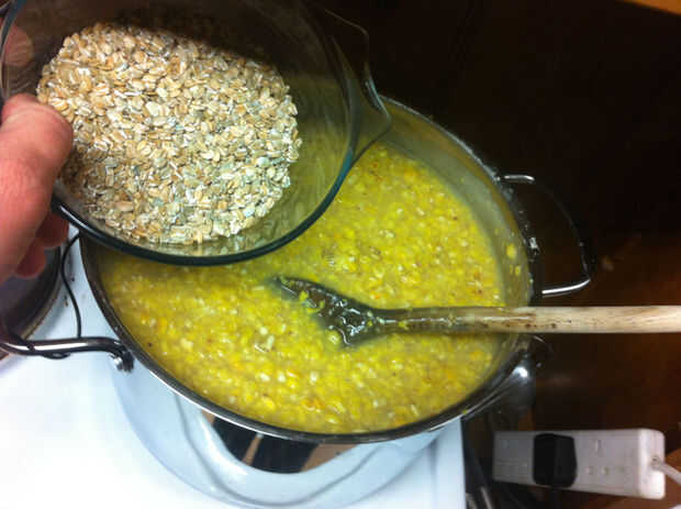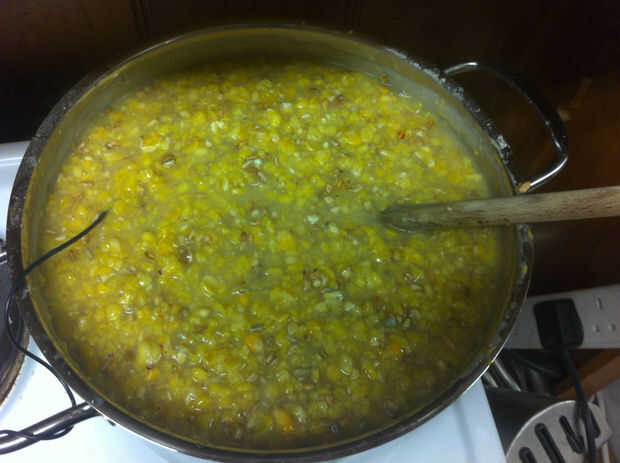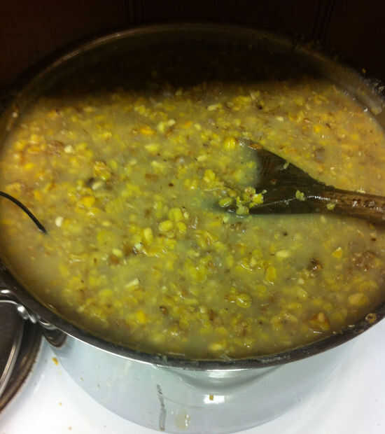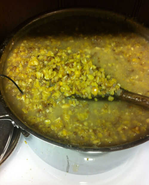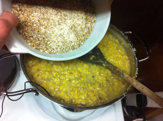 Ponga el maíz a hervir, alrededor de 90 grados C lentamente, esto licuar el almidón en el maíz, tenga que mover así que es no se queme en el fondo. cuando su en ebullición mantenerlo allí por al menos 1 hora y luego retirar del fuego y apague el quemador. Si utilizas una olla con un encapsulado base usted necesitará seguir revolviendo unos minutos más ya que tienden a mantener cocción durante unos minutos. Durante la cocción, notará que se pone gomoso como el almidón de licuar, tener una caldera de agua caliente en el stand de y sólo vierta algo de eso allí ahora y después para recargar los líquidos que se evaporan fuera, deberás acabar con unos 5L o más en el bote.