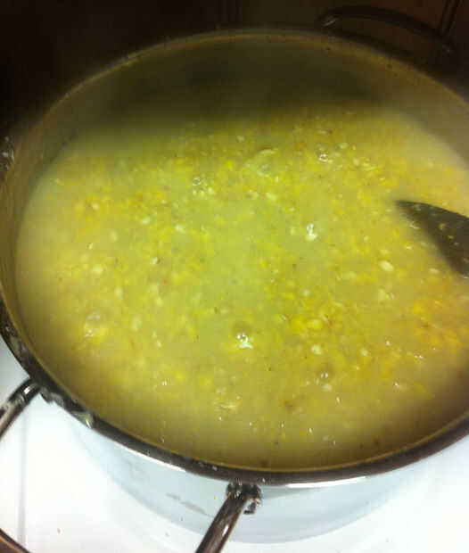 lentamente, añadir el maíz agitando en, esto detendrá lo aglutinen. Si se pone el maíz en agua tibia se agrupan para arriba y luego no cocinar correctamente.