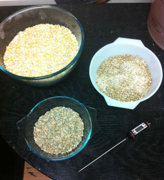 Pesar tus cosas, si usted está haciendo 4 lotes a dividir las cantidades por 4 así 1300g de maíz, 125 de g de centeno y Malta de cebada 200g.