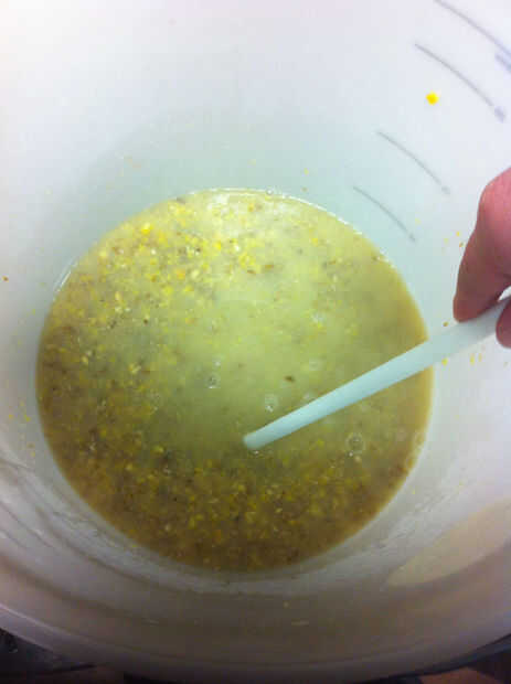 mientras está enfriando revuelo ahora y entonces, cuando llega a alrededor de 66 grados C (148 F) añaden en la cebada malteada, tienes que hacer esto un poco a la vez y revuelve antes de añadir el siguiente bit. Qué hace la cebada malteada es convertir el almidón del maíz en azúcares utilizables que la levadura se puede utilizar más adelante. la cebada malteada tiene una enzima que convierte el almidón. Ya agregue en usted notará su llega a ser más fácil y más fácil y más líquido.