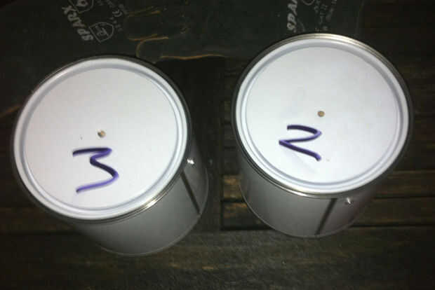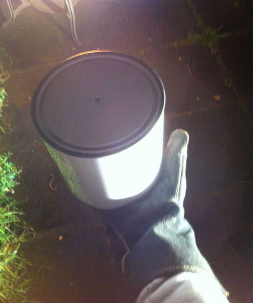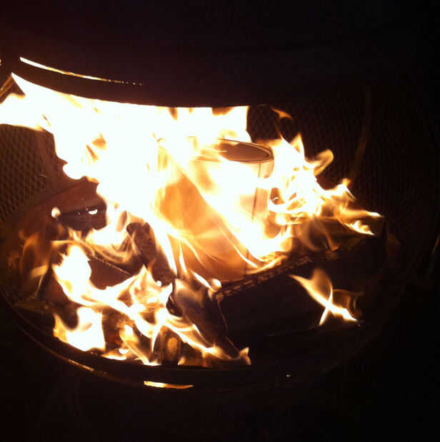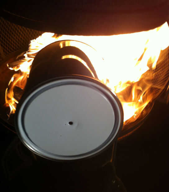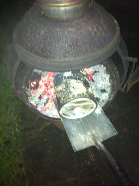 ahora es un juego de espera, finalmente usted comenzará a ver vapor y humo procedente de las latas y eventualmente catch fire los gases procedentes de la madera. una vez que muere hacia abajo y no hay ningún humo o llamas, uso una pala para retirar las latas del fuego hacer uno a la vez y guantes de trabajo pesado, he usado mis guantes de soldadura. Y desea entregar las latas y ponerlas en el pasto o tierra por lo que el aire no se puede obtener a través del orificio.