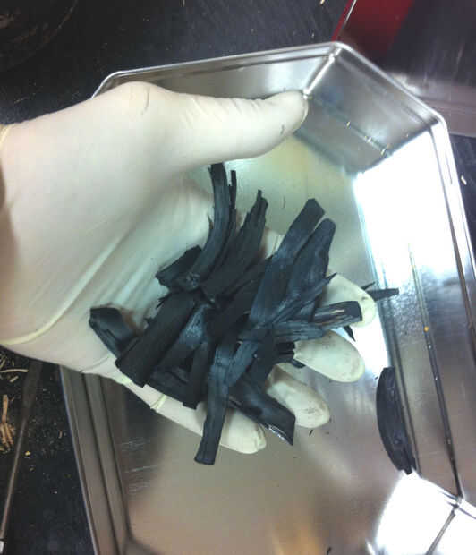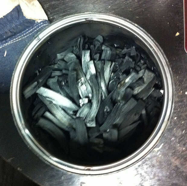 I utilizar guantes de látex para mantener mis manos limpias, quitó la tapa con un destornillador y que el carbón de leña en una lata de galletas para su uso posterior.