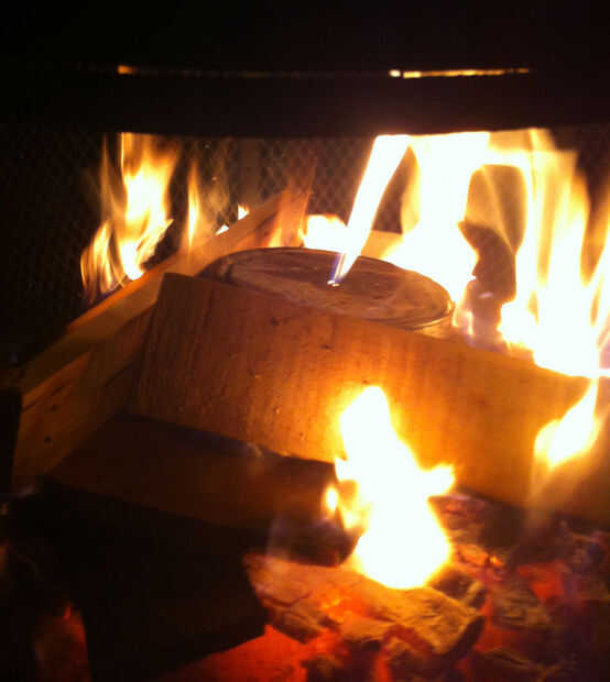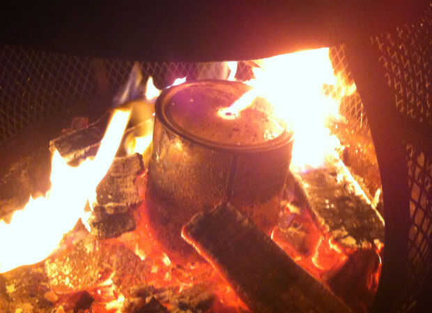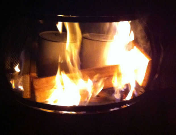 una vez que tengas suficientes brasas puede poner las latas, pero espacio que sacarlos un poco que quieren el calor en todas ellas. no importa si algunas de la madera todavía arde con llama de hecho usted puede poner algunos más en alrededor de las latas para guardar el calor, que es lo que hice. Asegúrese de que poner las latas en el orificio es en la parte superior y no no obstruya el orificio para que los gases pueden escapar.