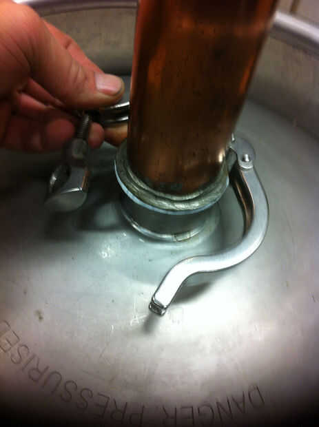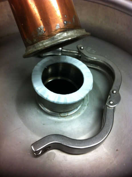 Ahora a montar el alambique, poner en el 2" Junta PTFE, en va la columna y luego la thumper, que antes de que su adjunto jarro en algunas de la cerveza para que el tubo de entrada está por debajo de la superficie, pero no demasiado porque no quiero salpicar para ser demasiado violento cuando las burbujas rompen la superficie.