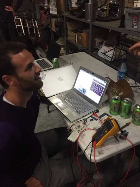 Ken Caluawerts desde el laboratorio de robótica de la NASA tensegrity fue nuestra electrónica. Me mostró un video de un prototipo que se construyó con el robot de la NASA tensegridad con luces brillantes en los extremos, y fue muy hermoso. Ya que queríamos tener un elemento interactivo a la pieza, se decidió usar su descubrimiento y aplicarlo en las tapas de la escultura. Decidimos usar el acelerómetro para accionar las luces. Más la escultura respondió para peso como personas subimos, más se enciende.