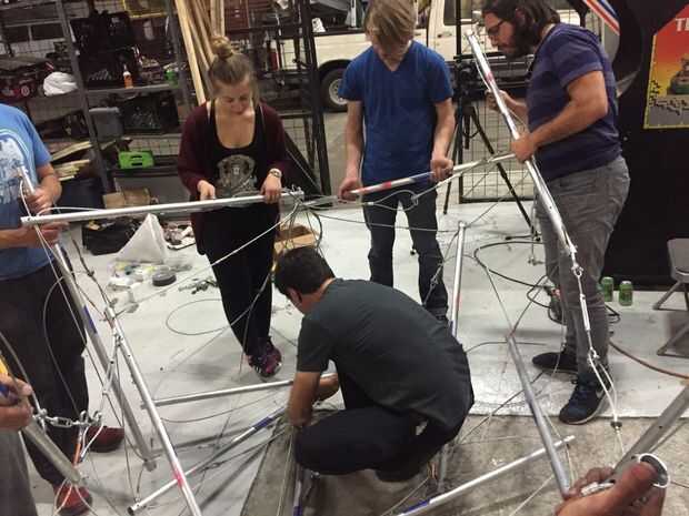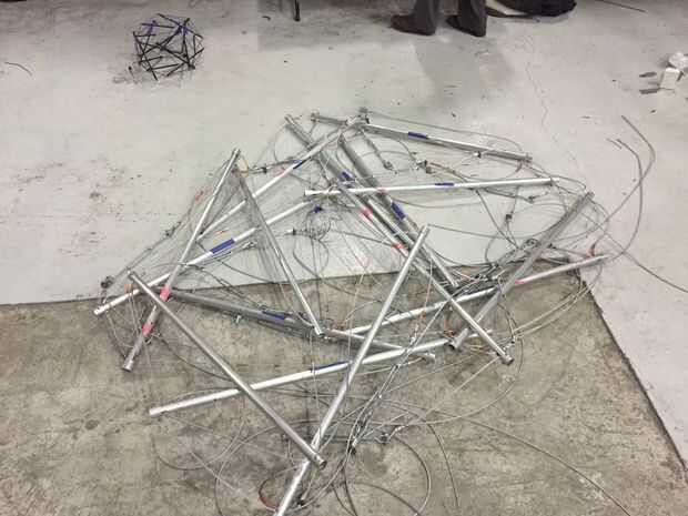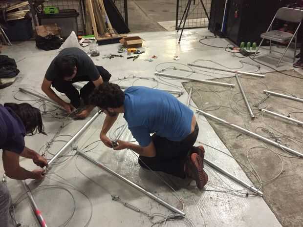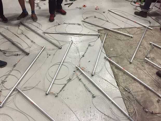 La primera vez probé, fue hecho usando una técnica de envoltura. Todos los polos fueron establecidos en una torre de 5 x 3 y envuelto alrededor. Esto funcionó bien para los modelos de juguete pero rápidamente fuimos perdimos en postes y cables durante el montaje. Terminó en un montón de palos y cuerdas en la tierra :/