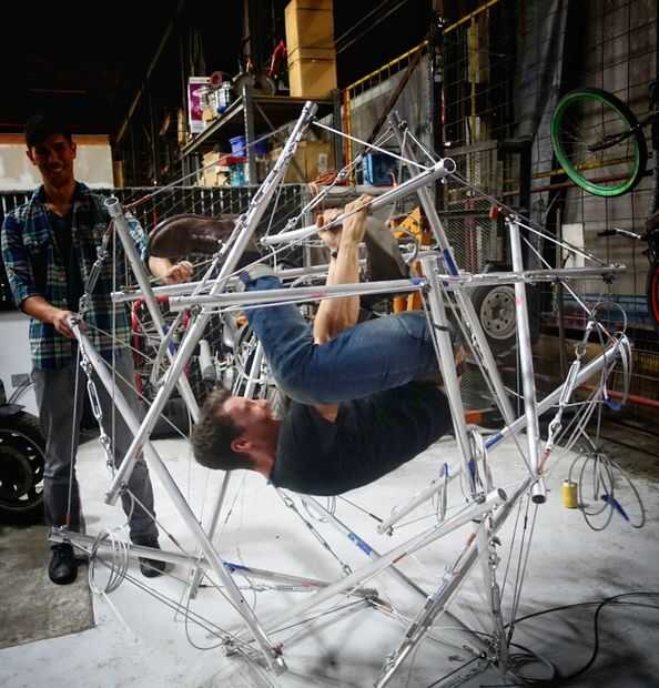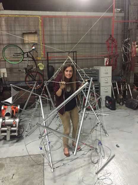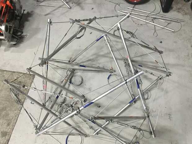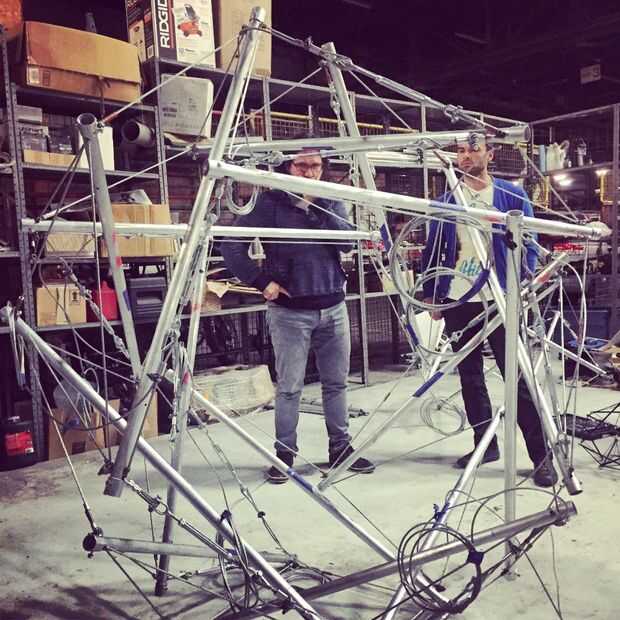 Hemos construido un sistema de polipasto primitivo con la grúa de la tienda para tener una mejor idea de cómo se unieran. Otro avance fundamental fue la decisión de utilizar clips de cuerda de alambre para sujetar los extremos en su lugar; de lo contrario, los extremos se deslizan y era casi imposible. Era un enfoque iterativo: una vez aproximadamente en el lugar, hemos ajustado las longitudes para conseguir una mejor aproximación.
