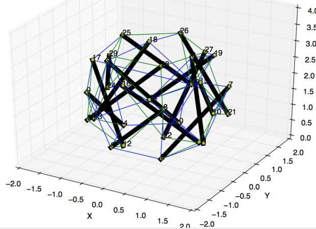 Por suerte, hemos tenido acceso a algunas investigaciones de vanguardia desde el equipo de robótica de tensegridad de NASA (dirigido por Vytas Sunspiral). Atil Iscen y Ken Caluawerts que ambos ayudaron a desarrollar software a la medida para analizar las estructuras de tensegridad. Esto utilizó un diseño computacional de vanguardia para ayudar a validar la estabilidad de la forma.