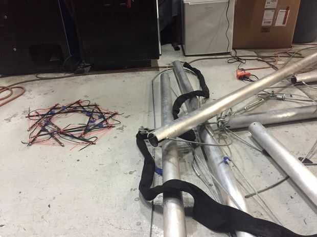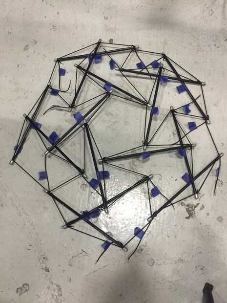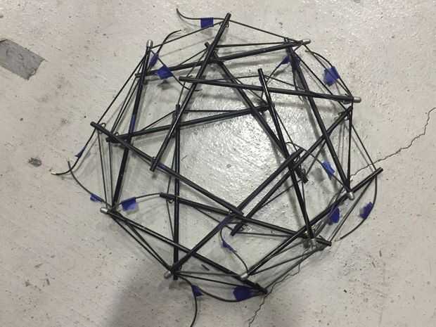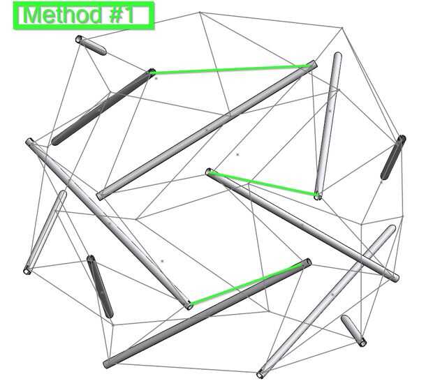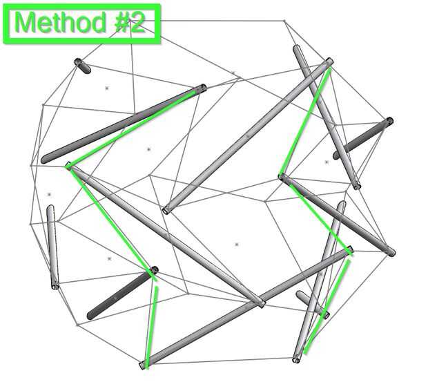 Método #2 se basa en aprender la manera dura que cada faceta de la forma (triángulo, cometa o quad) tendría un turbuckle para permitir un ajuste sistemático de la estructura. Colocándolos en el lugar correcto, hay una línea continua de tensores que puede rastrearse a lo largo de la estructura. Éstos resultaron para ser las diagonales en el ejemplo de bungee. También nos permitió una manera fácil de ocultar el cableado para la electrónica, como tuvimos que cubrir también los tensores. Con los tensores en cada diagonal (CW/CCW/CW) permitió la estructura comprimir y embalar plana a lo largo del eje. ¡ Un éxito!
