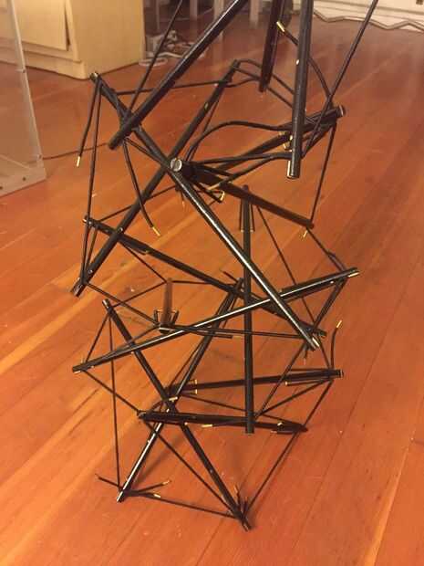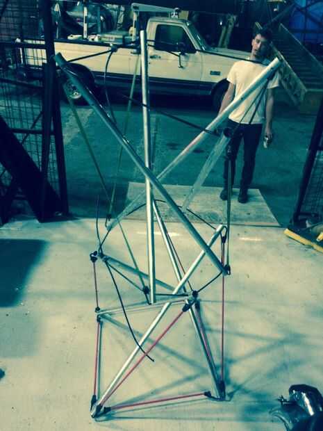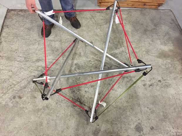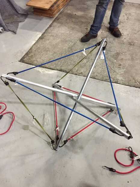 Llegó el momento de empezar a construir una prueba de concepto. Al principio, Joe y prototipo utilizando cuerdas elásticas y postes de aluminio de 1''. Fue bastante sencillo para construir cuatro puntal modelo después de conseguir la longitud bungee, pero la tensión en el sistema no distribuida de una forma estable. Asamblea comenzado tejiendo las costillas en una sola dirección, y fijación de los extremos. A continuación construimos una torre apilando dos cuatro modelos, con alternancia de capas de CW y CCW del puntal. Era difícil de manejar la tensión en la estructura, y es difícil a escala de la técnica. Fue un total desastre.