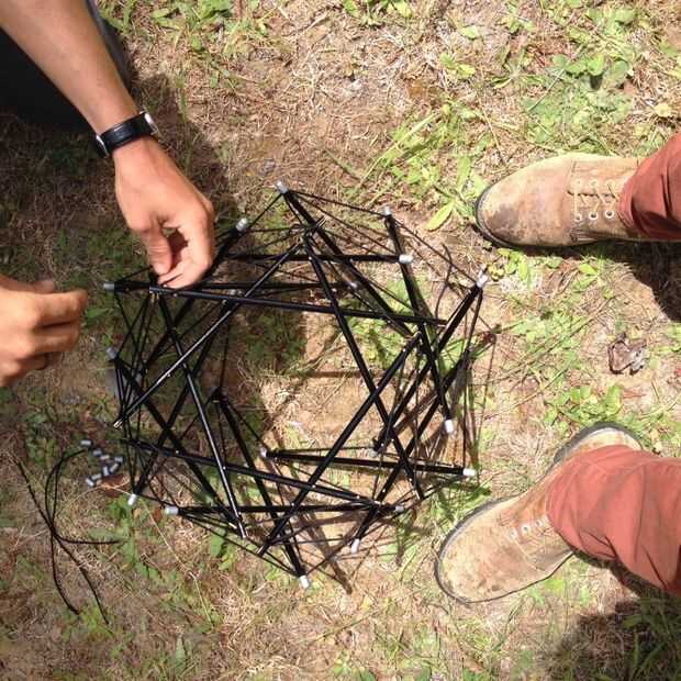 A continuación, tomé la inspiración de una técnica que René Motro escribió, llamado el 'circuito del puntal', lo que significa un circuito continuo para definir el límite de las cometas que son visibles en las facetas de un tensegrity. Me di cuenta de que esto podría ser implementado en una manera muy simple cortar las ranuras de los tubos y enhebrando a través. Esta técnica fue un ganador porque redujeron el trabajo total y tiempo de montaje, así como reducir el coste del hardware. Otro importante fue que tuve que comprar los casquillos de extremo costoso.
