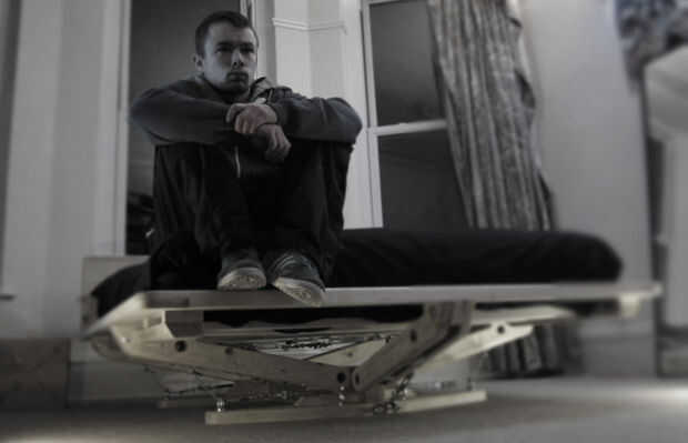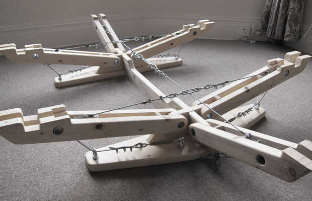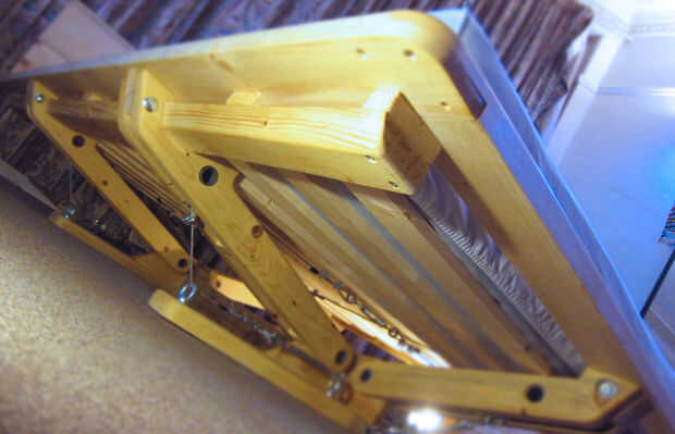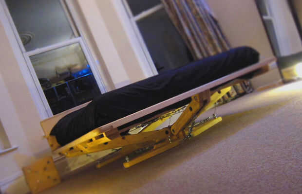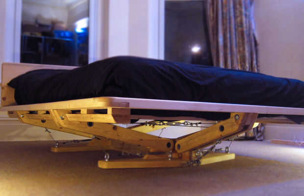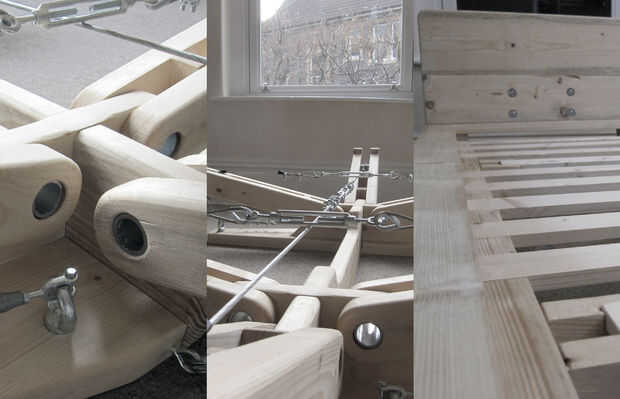 Y esto es lo que se me ocurrió. Seis brazos llegar de una columna central para apoyar la envolvente de la cama y cabecero. Estas armas son perno articulado en la base, con cable de acero tensado entre brazos opuestos para restringir su anchura y más aparejo hasta el fondo para crear una estructura estática, nivel. La base se extiende hacia fuera para evitar que todo el asunto vuelco cuando su sentado en un borde con mínima flexión.