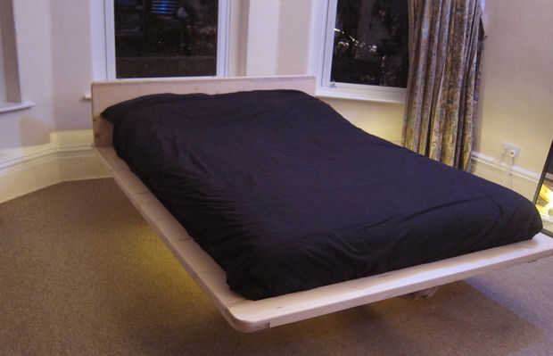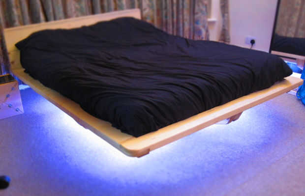 Me puse a diseñar un marco de la cama que le dio la ilusión de estaba flotando, para acabar con el generalmente de la pierna en cada esquina y tratar de ocultar la estructura de la base de lo mejor que pude cuando se ve de pie...