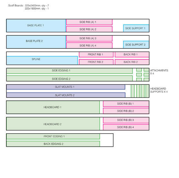 La cama se hará de 8 tablones del andamio (7-2400mm y 1 de 1800mm de largo). Usted puede regularmente recoger baratos de recuperación/reciclaje yardas, que ayuda a mantener los costos abajo de madera.