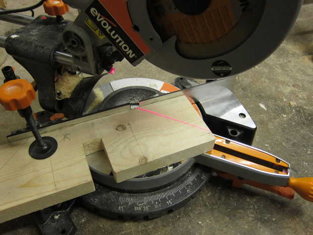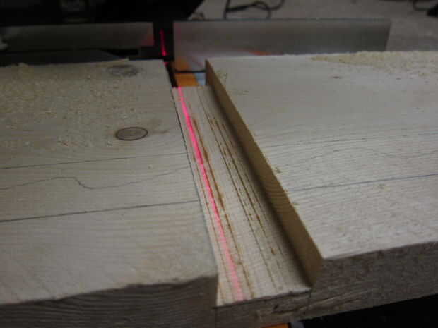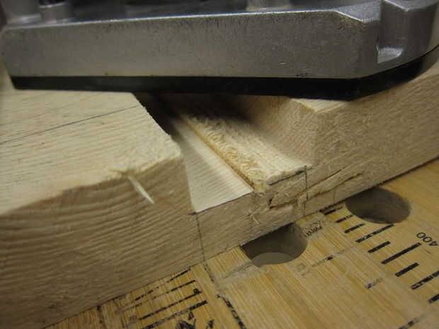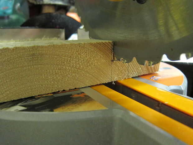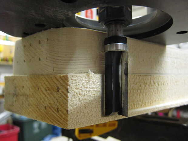 - Para la hendidura a través de la anchura de la parte, primero utilicé una ingletadora con el tope de profundidad dedicado (juego ligeramente por debajo de la profundidad necesaria) y varios cortes para remover la mayoría del material. Luego usé un router para terminar el corte a la profundidad correcta.