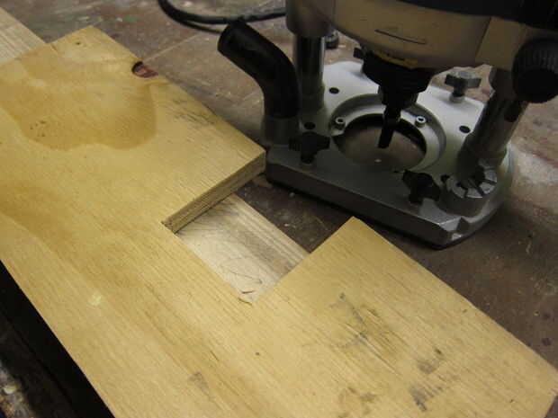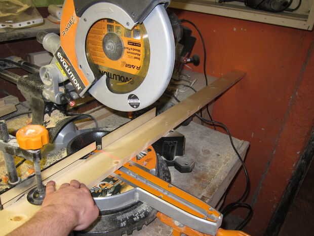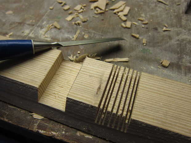 - Hendiduras se cortaron otra vez utilizando el mismo método. Múltiples cortes con la sierra inglete a la profundidad requerida y luego limpiaron con un cincel.