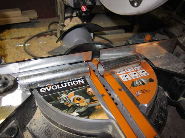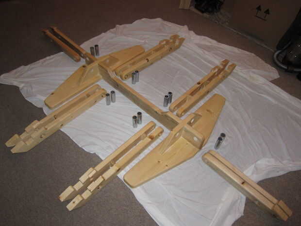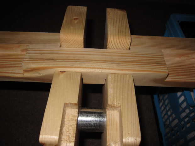 La tubería que utilicé para los pasadores (ø 34mm) fue dejada sobre mi anterior proyecto andamio de la estantería, así que comencé a montaje por corte que se necesitan las clavijas, 12. Los brazos pueden montarse ahora a la estructura base. Tiempo para obtener aparejo...
