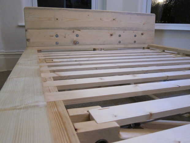 - El cabecero se coloca sobre el marco y agujeros perforados a través de él y la cabecera soportes. Entonces, la cabecera se puede empernar en lugar.