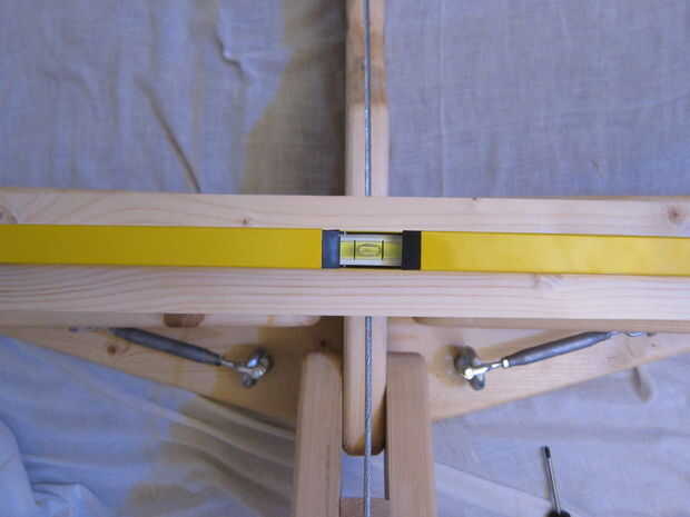 - Montaje del perno superior de cada brazo está conectado hasta el final de los puestos base. Los brazos pueden fijarse ahora en una estructura estática apretando los tensores en apposing lados, hasta que las burbujas de nivel en el centro!