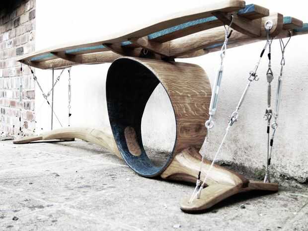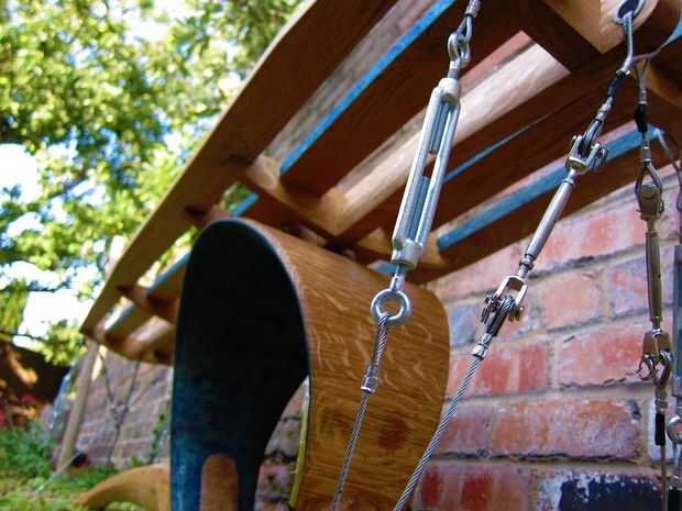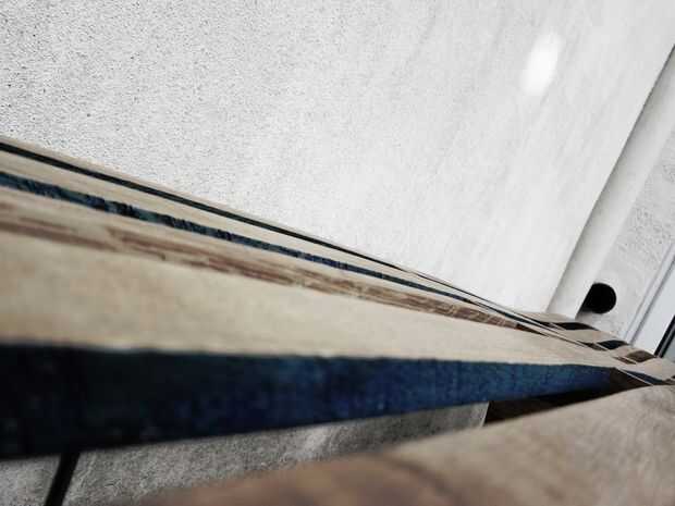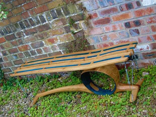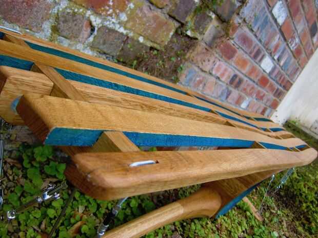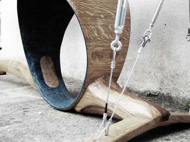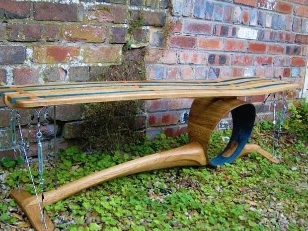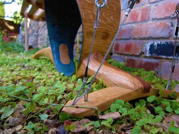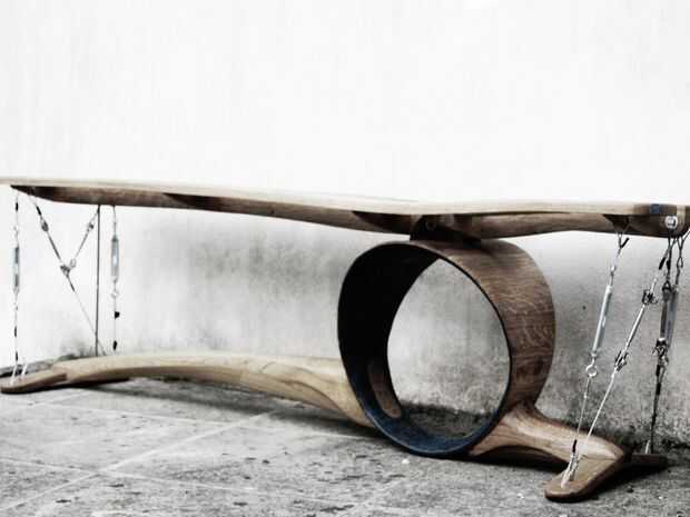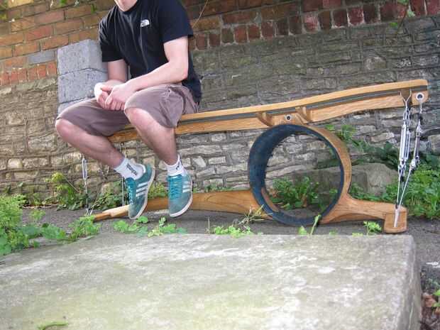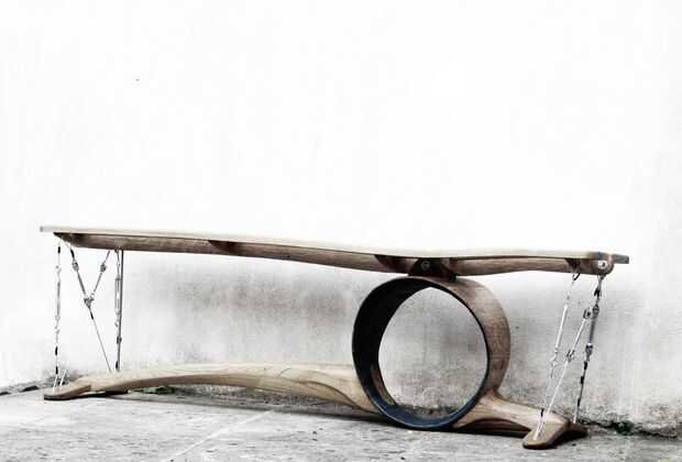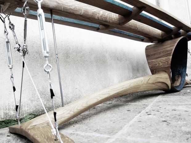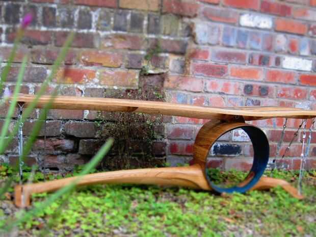 Un bucle fuera del eje se conecta a dos patas, cada una de ellas es mano tallada (con la ayuda de un cortametales angular) en una forma que fluye. Pies doblados de vapor y listones de añadir a esa estética. La parte superior del asiento se equilibra sobre el lazo gracias a cables tensados en extremo y en un puntal de fino.