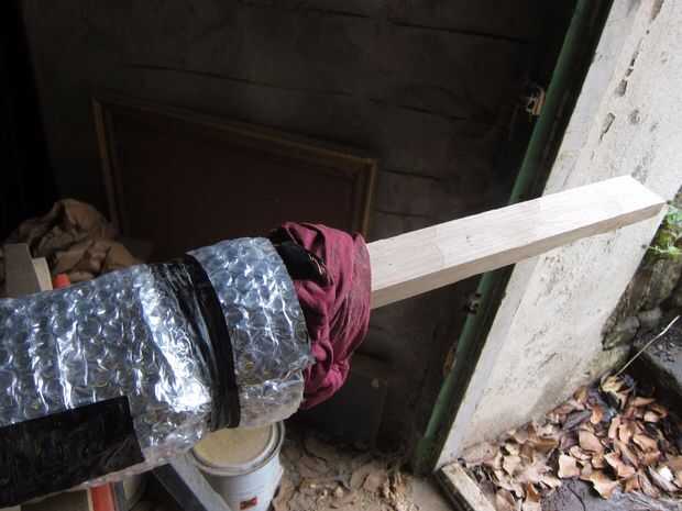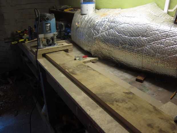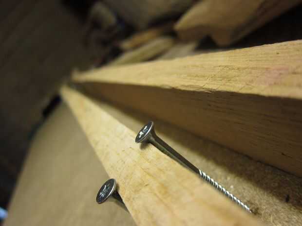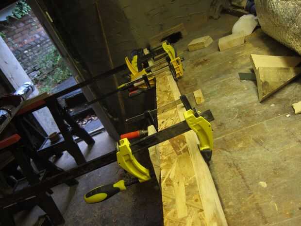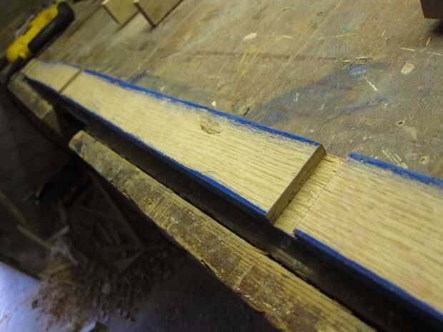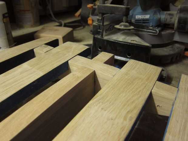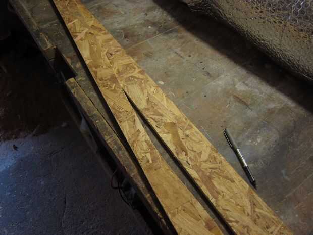 Otro tablón fue planeada hacia abajo y cortar a la anchura requerida. 4 igualdad de piezas para los listones y un trozo ligeramente mayor para la columna central.