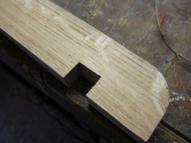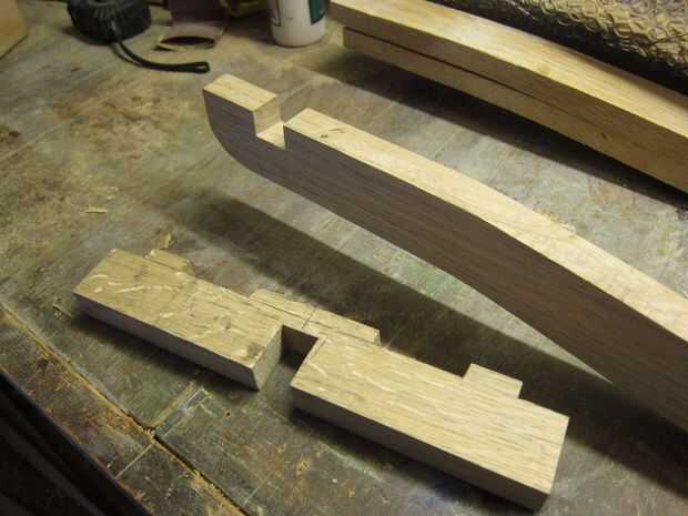 La curva de la espina dorsal fue bosquejada en y cortan utilizando una sierra de calar. Cortaron las muescas para los travesaños y perforar un orificio para el pasador-pivote. Se cortan los miembros cruzados; las muescas correspondientes cortan para unirse a la columna vertebral y otros para los listones.