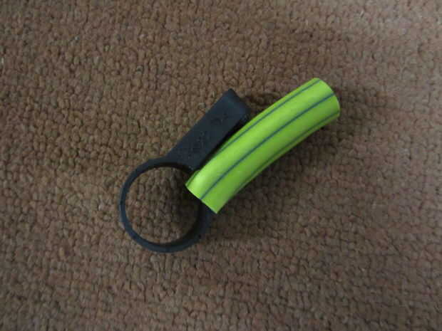 Tomar el pedazo de manguera y ponerla en la parte redonda del reflector. No encaja en fácilmente así que recomiendo ya sea poniéndolo en agua hirviendo o bajo una pequeña llama (rápidamente - no quemarla!) para facilitar el proceso. Sólo necesita cubrir el círculo de plástico así que recorte la manguera si es demasiado grande... Ya había hecho mi tensor para no poner la manguera en todo el camino porque todavía necesitaba ese reflector.